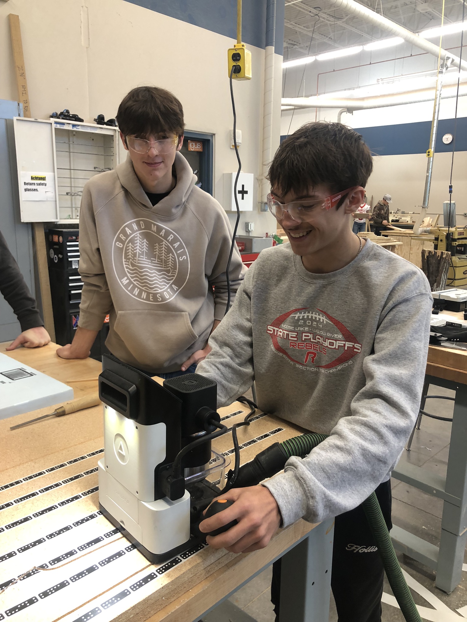 The Shaper Origin, a CNC router, purchased with NESC funds, has given students access to CNC technology in a way that has a very low barrier to entry. Students are rapidly creating quality joinery, templates, and signage. This is allowing them to create furniture like benches and dining tables with mortise and tenon joinery. Students are also creating signage for use in the school forest coupling their learning in CTE with the MNDNR’s No Child Left Inside initiative. Our efforts have been motivated by input from Morning Star Woodworks in Cloquet who has collaborated with us in acquiring the CNC router.
